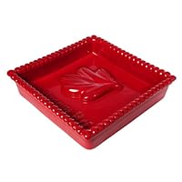 The set includes a square earthenware container with raised edges, and a heavy earthenware napkin weight shaped like a leaf (to hold down the napkins). The set is heavy and sturdy, and (like all Mamma Ro tableware) should last for years. The main container is large enough to function as a centerpiece to your table, and can be used to hold something besides napkins. It has raised letters on the inside center ("Mamma Ro"), so it doesn't make a good baking dish.
